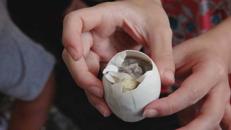 نام مرسوم این غذا در فلیپین ، balut است. برای تهیه این غذا ، تخم اردک را در زمین دفن میکنند ، پس از چند هفته که جنین در تخم شکل گرفت ، آن را خارج میکنند و به آرامی در آب جوش میپزند. و سپس آن تخم را به همراه پوسته ی آن میل میکنند.